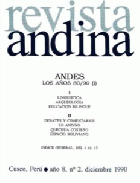 Contenido: Reconsideración del llamado quechua costeño. Rodolfo Cerrón-Palomino. -- Lo andino en Bolivia balance y prioridades. Xavier Albó. -- Modelos de organización del espacio un acercamiento a Bolivia. Jean-Paul Deler. -- Investigaciones sobre educación bilingüe en Perú y Bolivia 1980-1990. Juan Carlos Godenzzi. -- Arqueología peruana 1970-1990 algunos comentarios. Ramiro Matos Mendieta. -- La investigación arqueológica en el norte de Chile 1984-1990 evaluación y perspectivas. Mario A. Rivera.